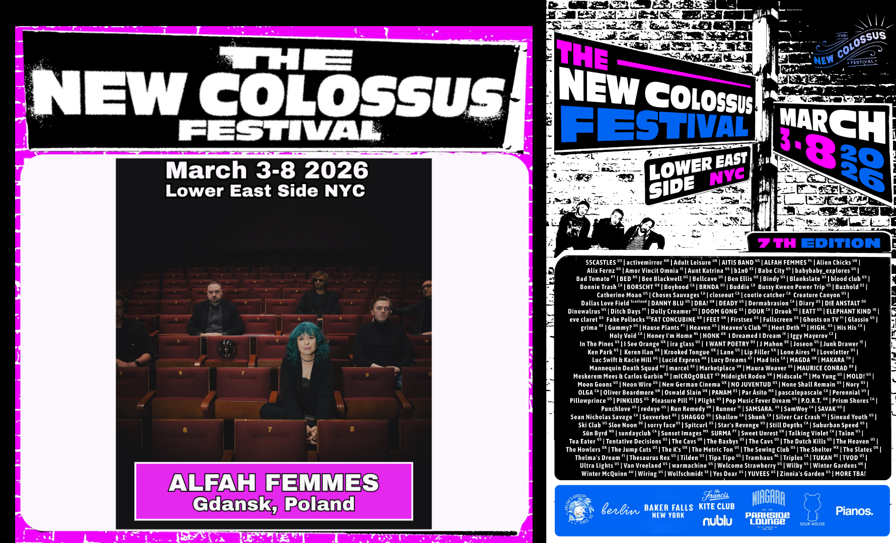 No photos this time, just a little film, courtesy of Marcin Kaproń DP who somehow managed to stick with us from sunrise to sunrise on the day of our first The New Colossus Festival show, witnessing awkwardness and enduring our nonsense with saintly patience. We had a blast, and that’s ours to keep forever <3. If you want to see the music video for our still-warm song ‘Yucky,’ it’s up on that once-revolutionary, now mostly garbage platform, flooded with TikTok shorts. You know the one.