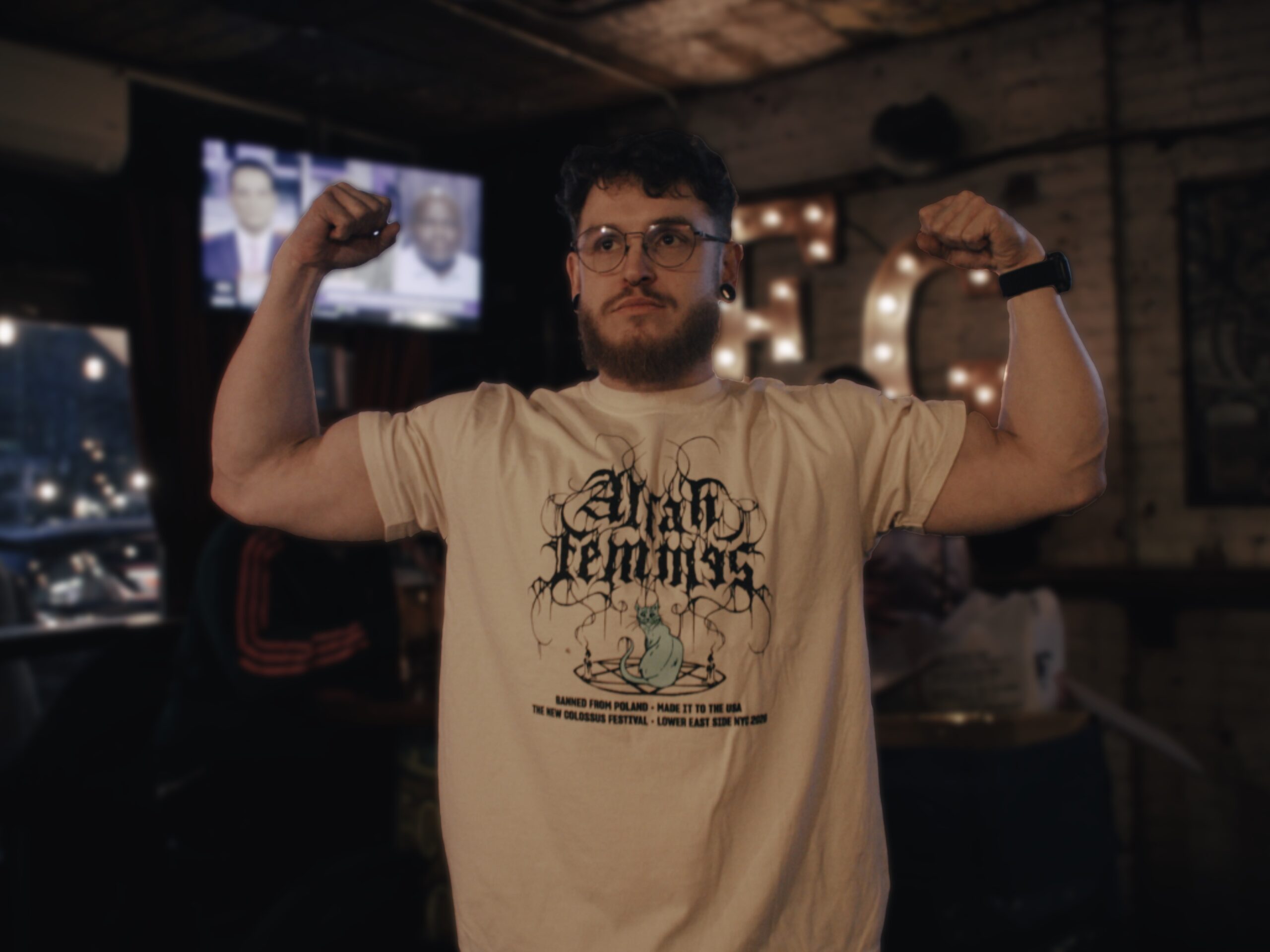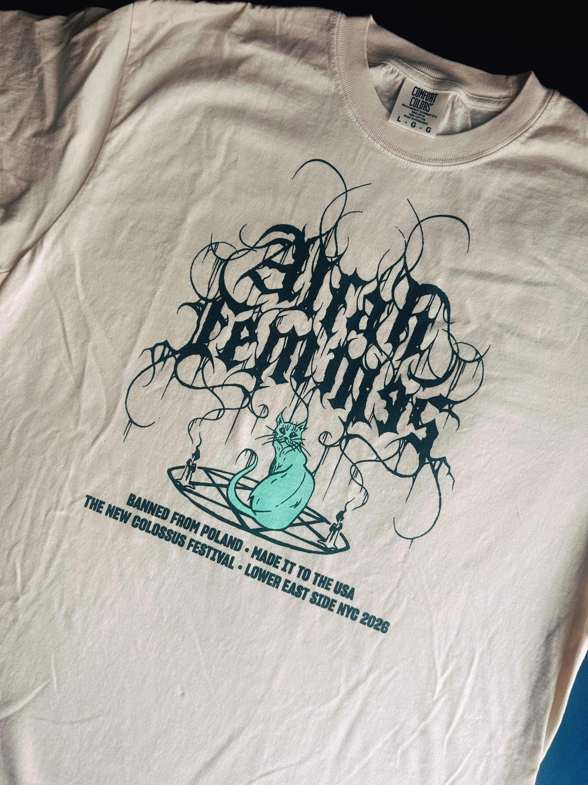 Limitowany wzór z okazji New Colossus Festival 2026, przedstawiający kota Alfah Femmes jako Statuę Wolności. Sitodruk wykonany lokalnie w Brooklynie przez Funhouse Screen Printing. Pozostałe egzemplarze z serii koncertowej.