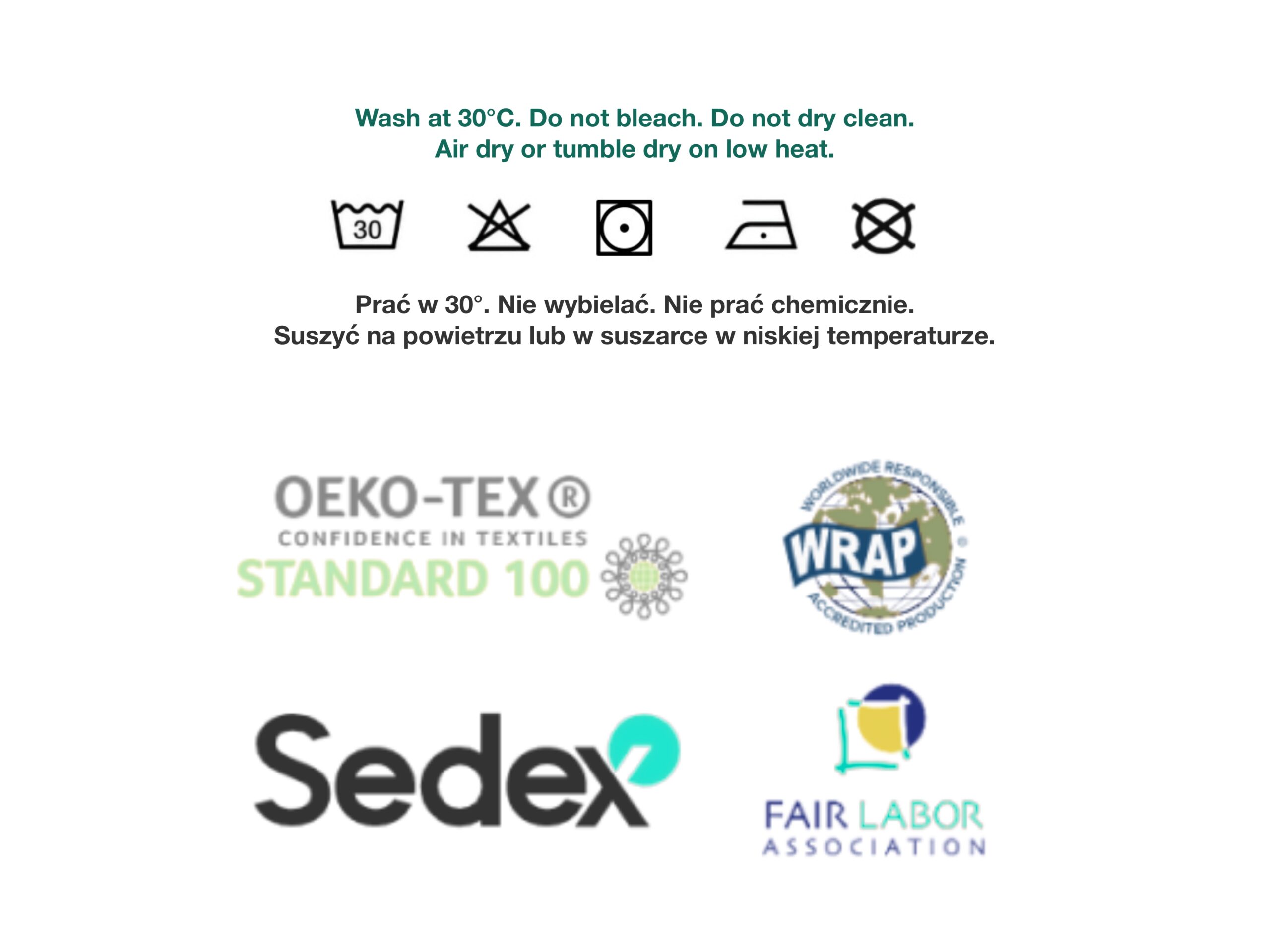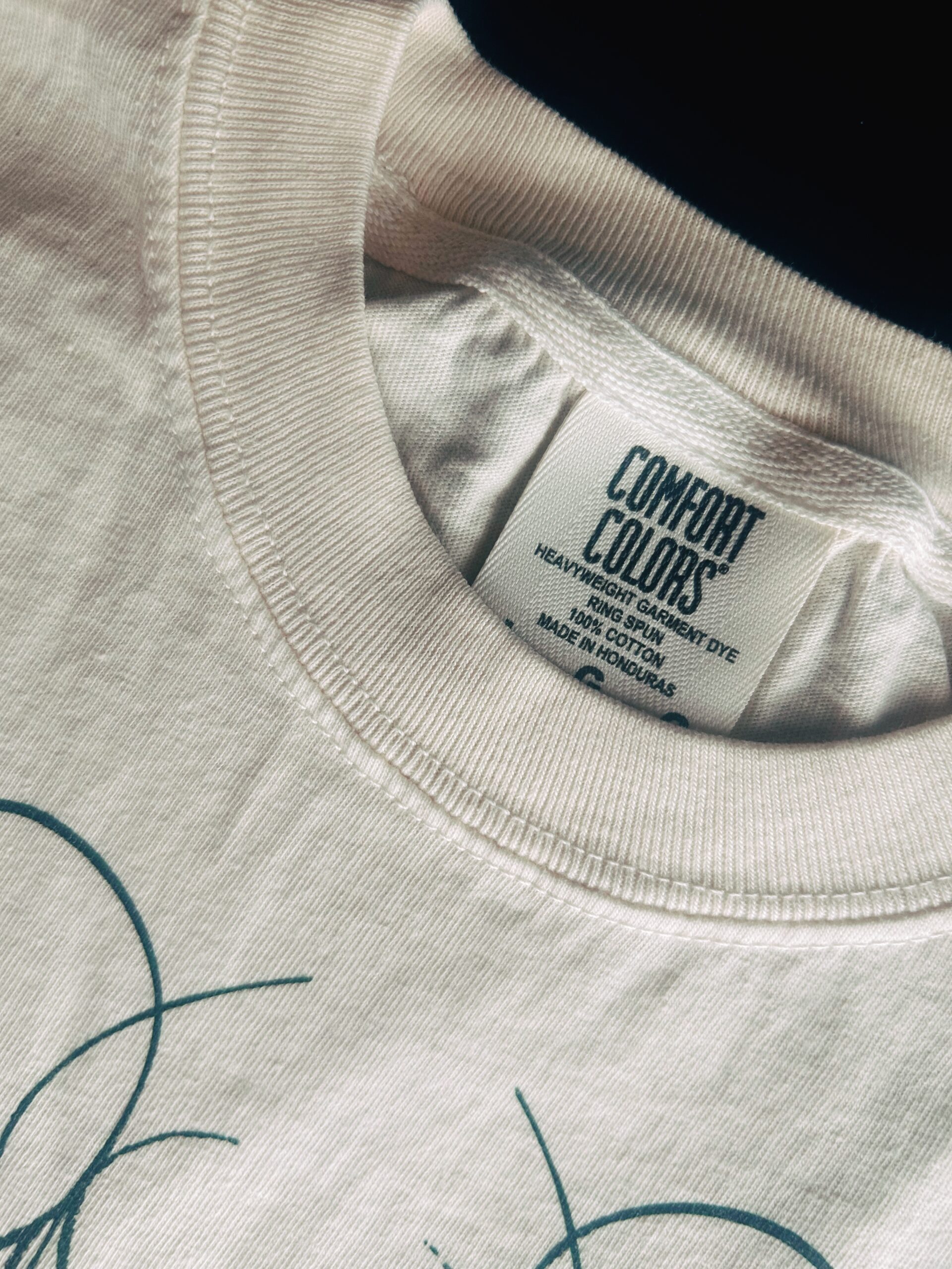 177 GSM (6.1 oz/yd²), 100% bawełna ring-spun z USA. Gruby t-shirt unisex o luźnym kroju, barwiony po uszyciu dla miękkiego, „znoszonego” efektu i minimalnego kurczenia w praniu. Bezszwowy korpus, klasyczny ściągacz przy szyi oraz wzmocnione taśmy na ramionach. Barwiony przy użyciu niskoemisyjnych barwników z certyfikatem OEKO-TEX, bez użycia soli.